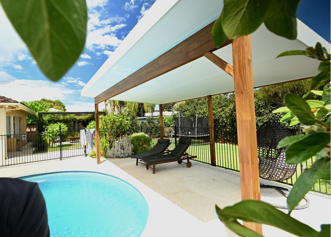 A Colorbond roof with matching flashing, gutters and downpipes provides durability and protection, while stormwater is directed to soak wells for effective drainage. The white timber lined ceiling underneath softens the structure and reflects light, creating a bright and comfortable space perfect for relaxing by the pool.