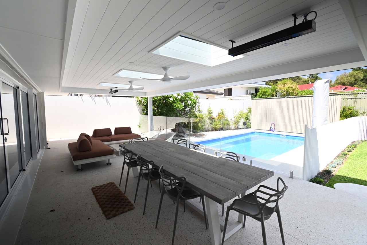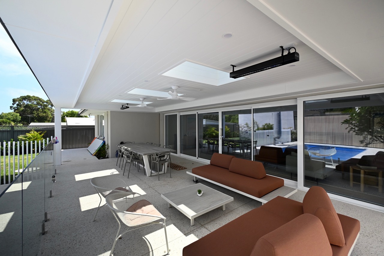 The result is a custom-built Skillion style patio, designed to maximise both coverage and openness. A Colorbond roof with integrated flashing, gutters and concealed box valley gutters ensures effective stormwater management while maintaining a clean architectural finish. Velux skylights introduce natural light into the space, brightening the patio and creating an inviting connection between the outdoors and the covered entertaining area.